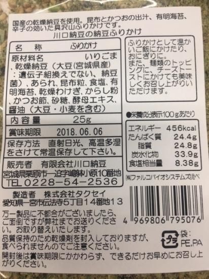 いりごま、乾燥納豆(大豆(宮城県産)遺伝子組み換えでない)、納豆菌、あられ、昆布粒、食塩、有明海苔、乾燥わけぎ、からし粉、かつお節、砂糖、酵母エキス、醤油(大豆、小麦を含む)