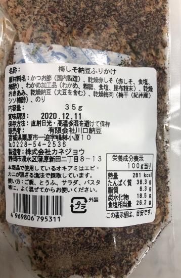 鰹節(国内製造)、乾燥赤しそ(赤しそ、食塩、梅酢)、わかめ加工品(わかめ、粗糖、食塩、昆布粉末)乾燥おきあみ、乾燥納豆(大豆を含む)、乾燥梅肉(梅干し(紀州産)シソ梅酢)、のり